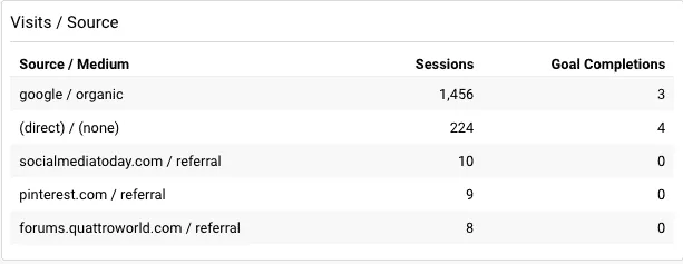 On the far right is the traffic channel sending visitors. The middle column shows Sessions (or visits). And the final one shows Goal Completions.