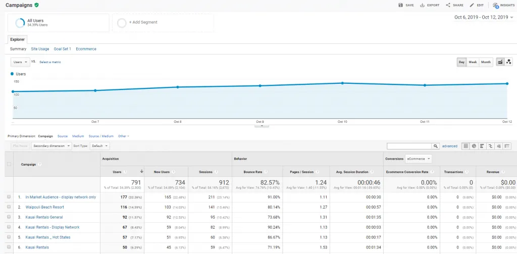 The initial page here will give you a summary of your campaigns and their success. You can see how many users, new users, and sessions have resulted through a certain campaign. You can also view more statistics about the behaviors of your visitors and your conversion rates. Simply scroll down to view this information.